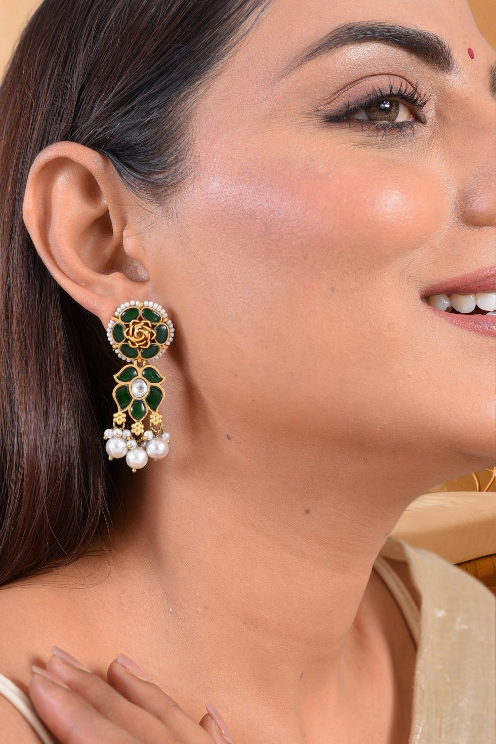 Silvre alloy Gold plated Earring with Faux pearls and stones.