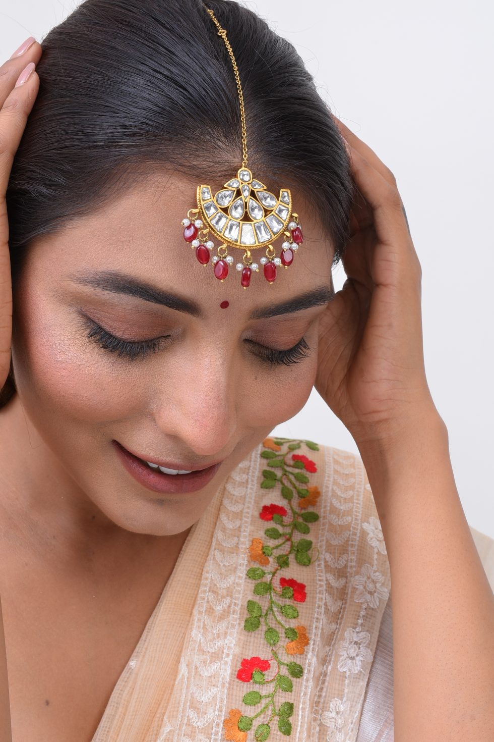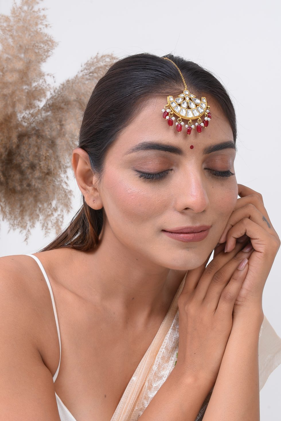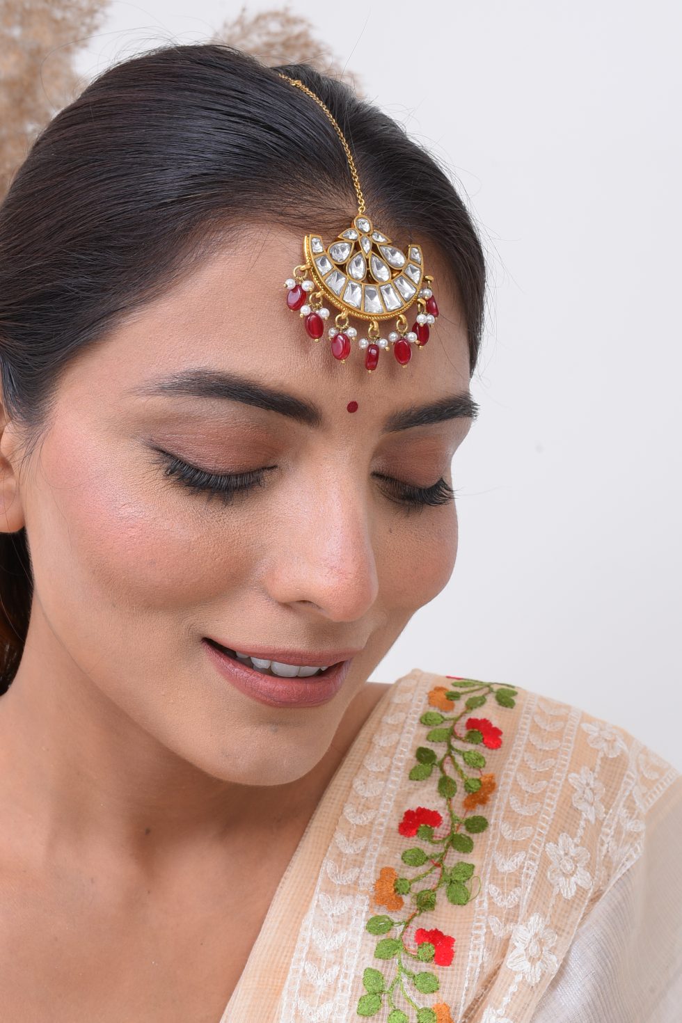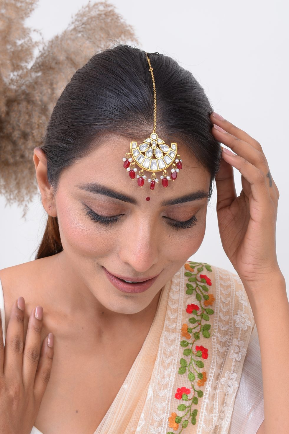 Handmade Gold plated silver alloy Tikka with stone polki and faux pearls.