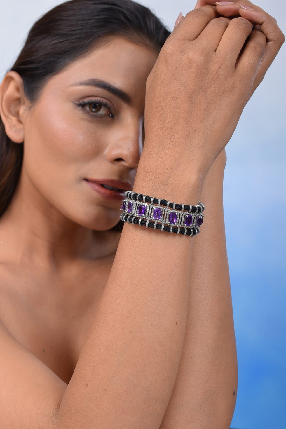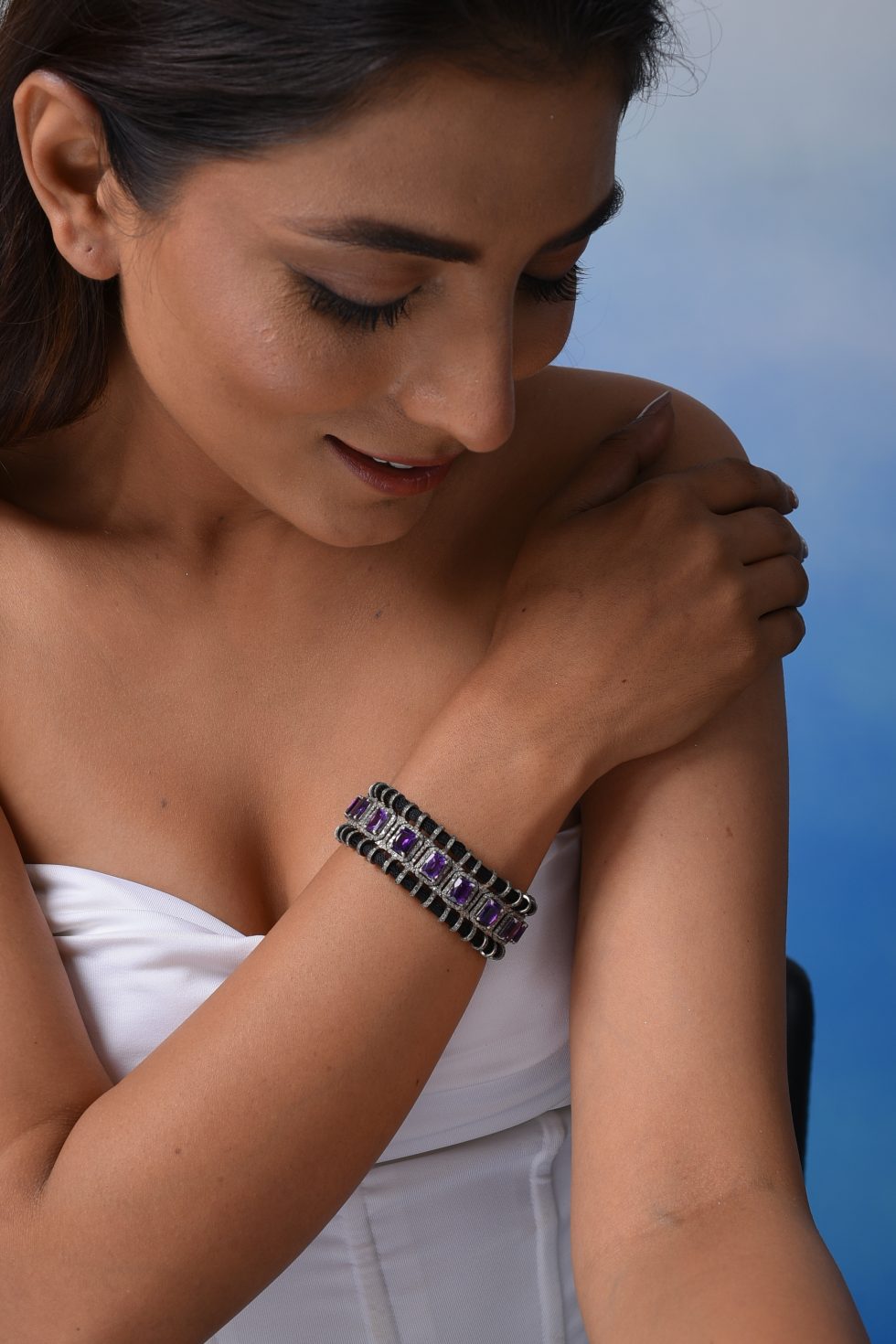 The gross weight of the silver pauchi is 31.83 grams approx. Made of 5.29 carats diamond, 2.1 carats emerald and 14.3 carats tanzanite.