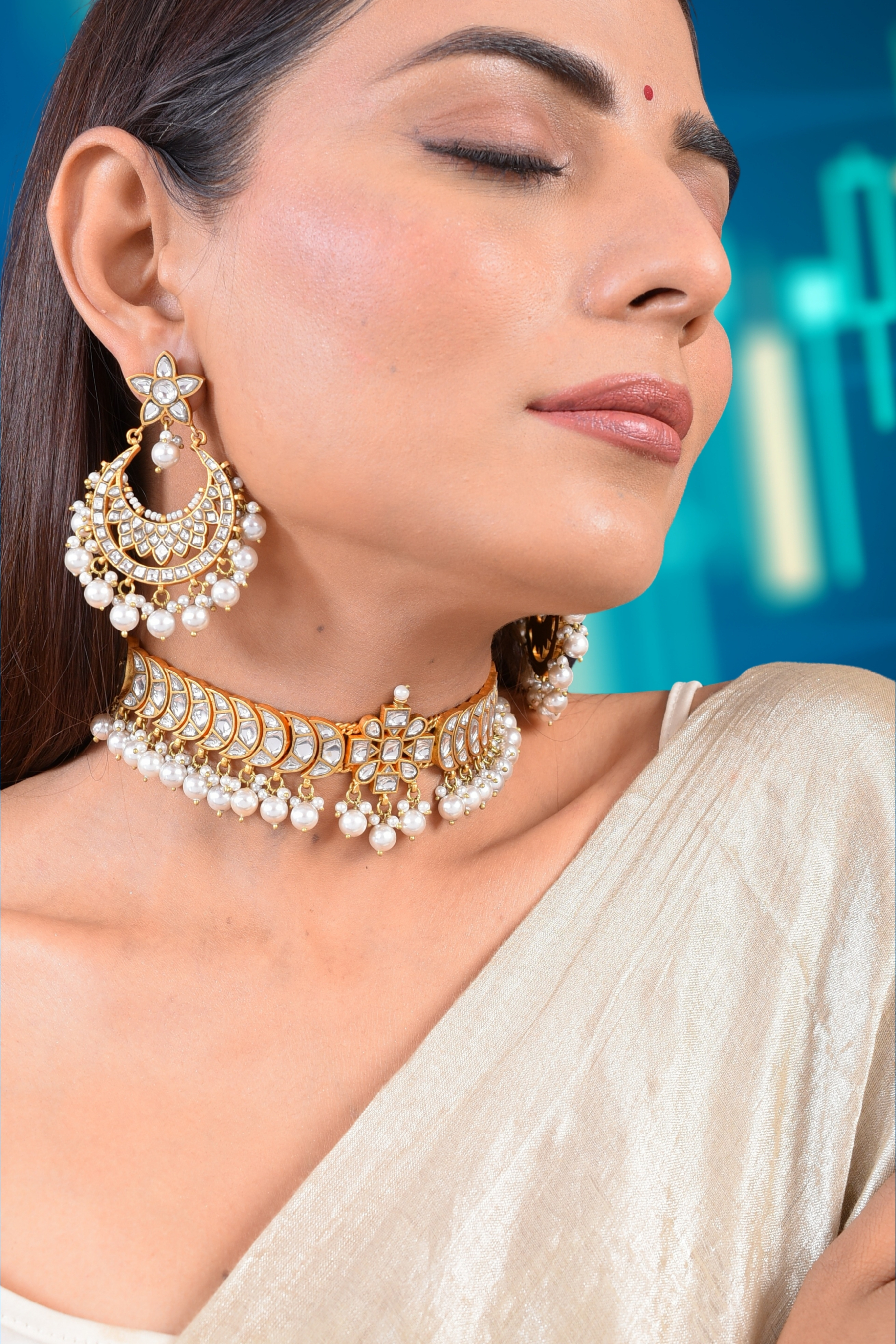 Handmade Silver alloy Gold plated necklace with stone polkis and faux pearls.