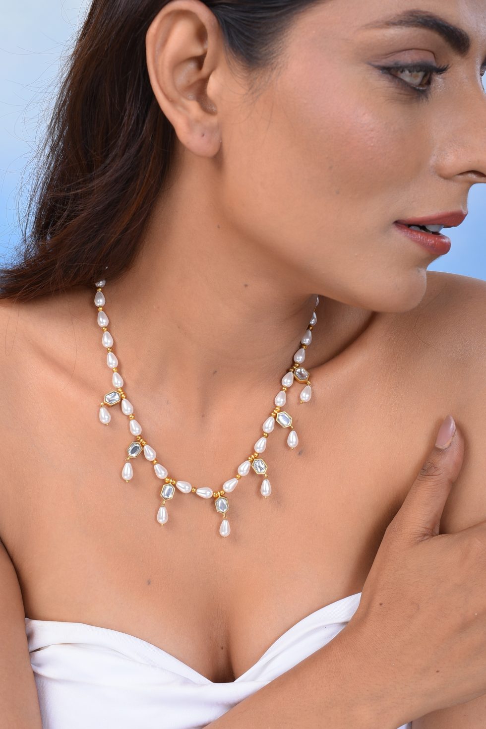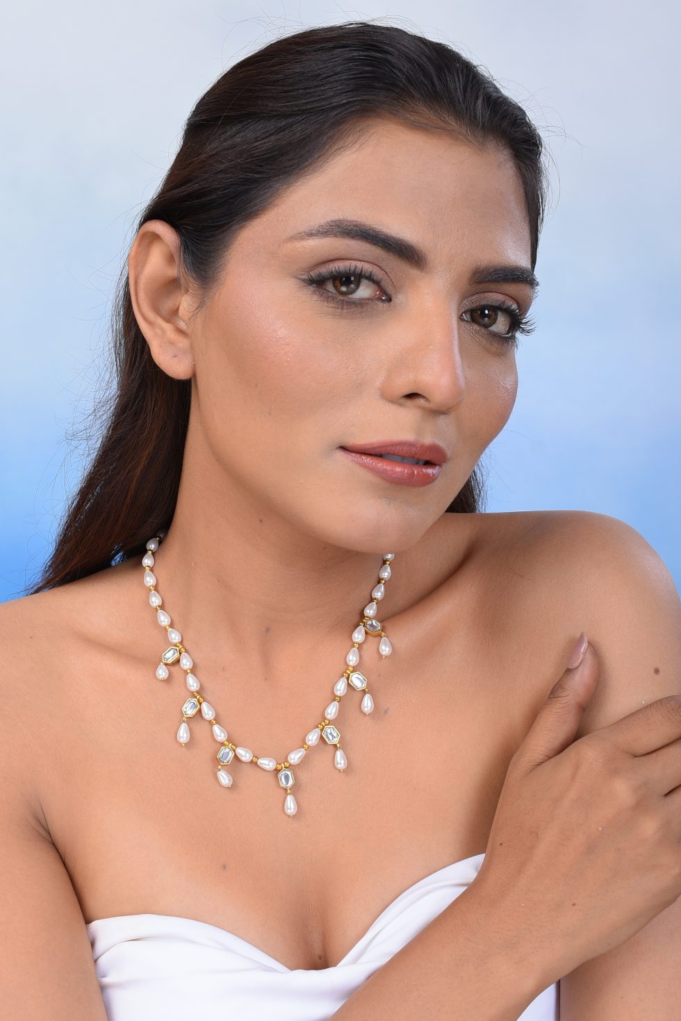 Handmade Gold plated silver alloy necklace with stone polki and faux pearls.