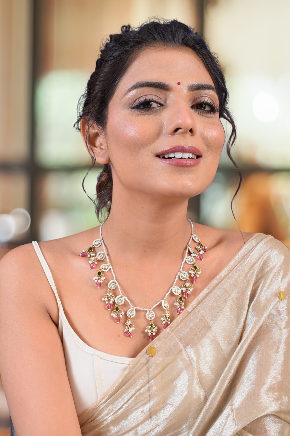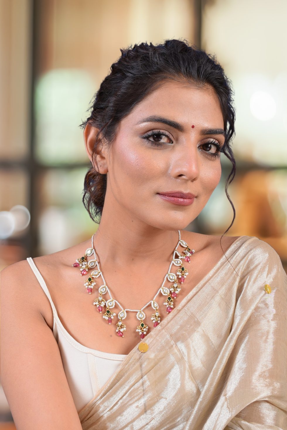 Handmade silver alloy gold plated necklace with stone polkis and faux pearls.